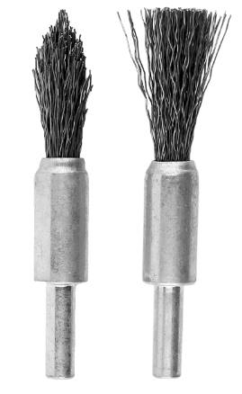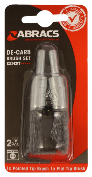de Abracs 2-delige De-Carb Staalborstelset bevat: 1x borstel met puntige tip en 1x borstel met platte tip. Ideaal voor precisie reiniging en ontbramen op moeilijk bereikbare plaatsen. Geplaatst op een 6 mm spindel.