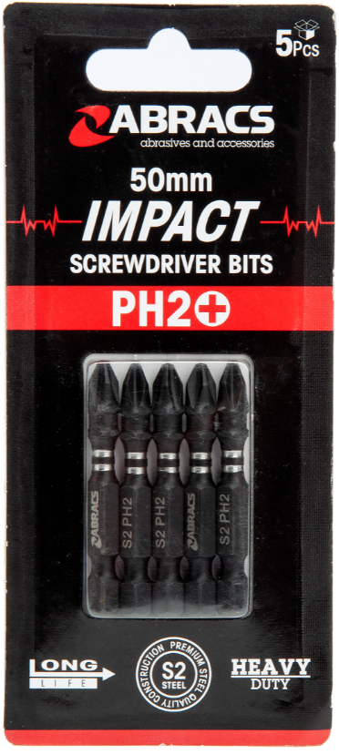 Dit is een setje van 5 met kopvorm PH-2 Impact Schroefbits van 50mm lang. Abracs Impact Schroefbits zijn vervaardigd van S2 Premium Staal voor een lange levensduur en zijn geschikt voor alle zware schroeftoepassingen. De toevoeging van de torsiezone vermindert de spanning en druk op het bit tijdens het boren, wat de duurzaamheid, levensduur en algehele prestaties verhoogt.