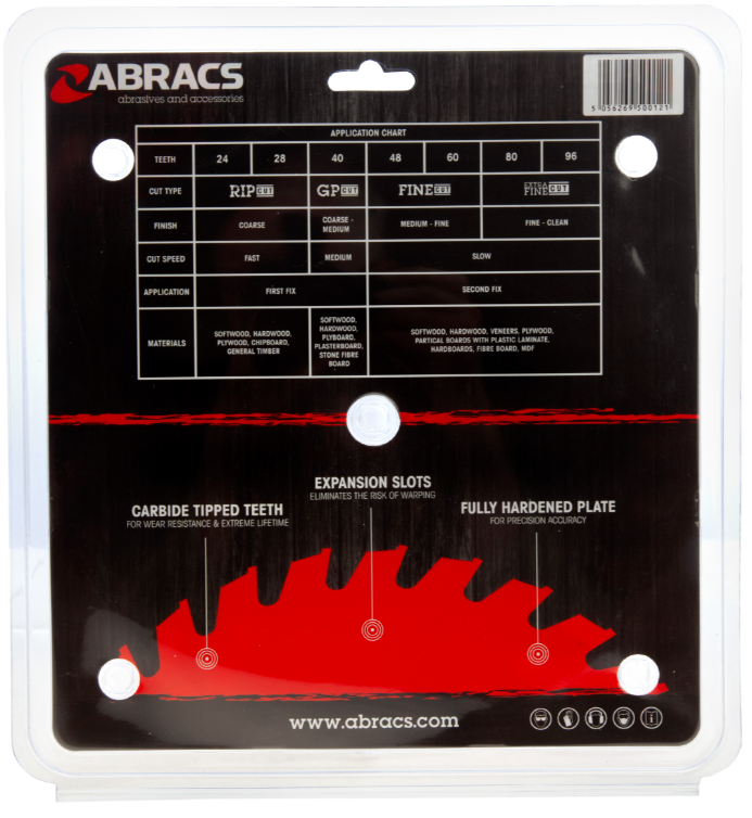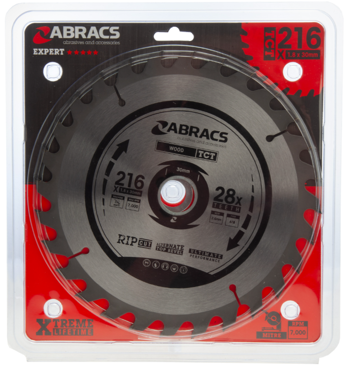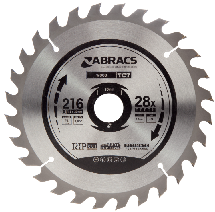 Deze Abracs Cirkelzaag is een cirkelzaagblad met hardmetalen tanden, ontworpen voor extreme slijtvastheid en een lange levensduur. Het blad heeft een diameter van 216 mm, een keuze 28, 40 of 60 tanden, en een dikte van 1,8 mm, wat resulteert in een zaagsnede (kerf) van 2,6 mm. Het blad is uitgerust met een volledig geharde plaat voor precisienauwkeurigheid en heeft expansiesleuven om het risico van kromtrekken te verminderen. Deze TCT-bladen van Abracs zijn verkrijgbaar in verschillende maten met diverse tandconfiguraties en snijtypes, geschikt voor alle soorten hout. Afhankelijk van de gewenste afwerking zorgen minder tanden voor een snellere snede, terwijl meer tanden een fijnere afwerking geven. Geschikt voor het zagen van zachthout, hardhout, multiplex en timmerhout.