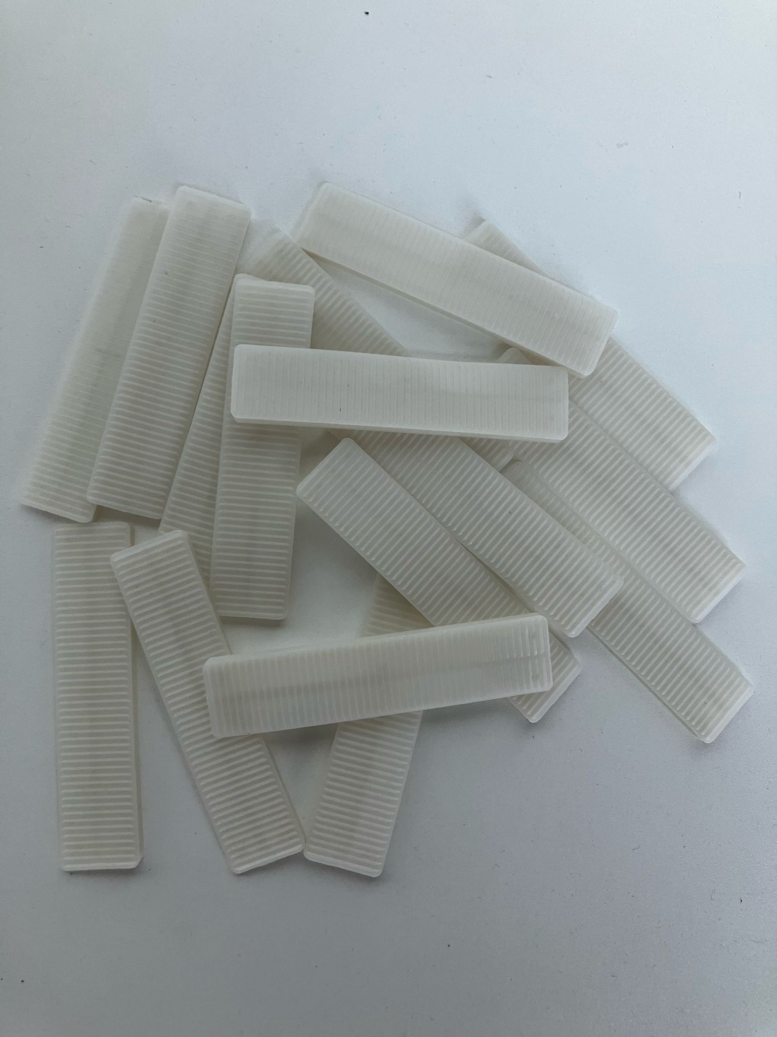 Keggen of ook wel genoemd wiggen zijn schuinaflopend, te bepalen van 1 naar 4mm of 4 naar 8mm. Kunststof blokjes hebben een lengte van 100mm, de breedte en dikte is naar wens te bepalen.