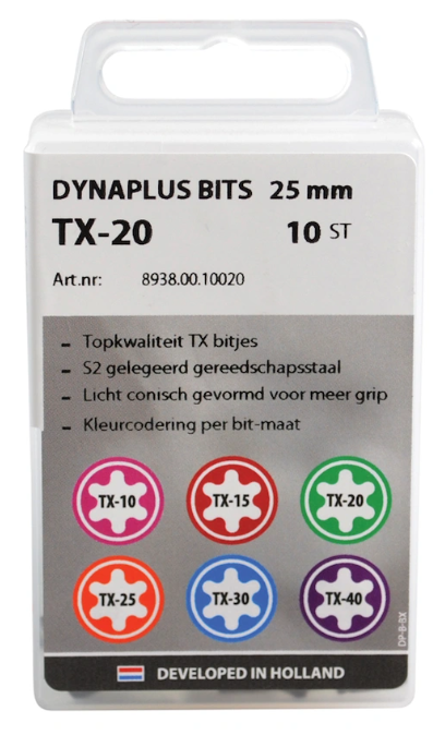 Iedere Dynaplus® TX-drive bit heeft een kleurbandje met een eigen kleur, deze kleur vind je ook terug op het etiket van het doosje. Als je verschillende afmetingen TX-schroeven gebruikt moet je soms van bitje wisselen. Verschillende afmetingen bitjes zijn lastig herkenbaar en dat maakt bitjes wisselen lastig. Dit handige kleursysteem lost dit probleem op.