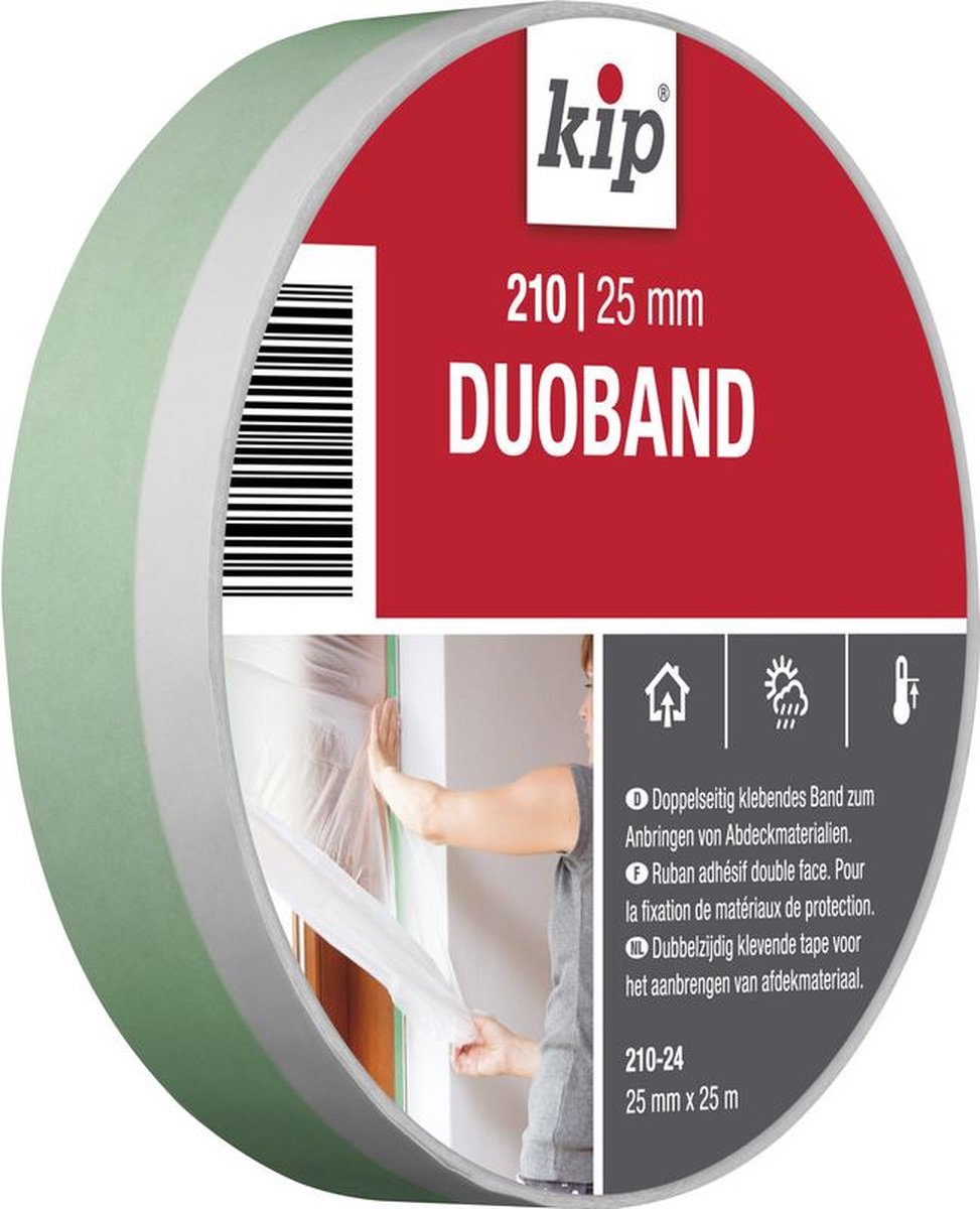 310 Kip Duoband 25mm/25m (groen/wit) is een dubbelzijdig klevende tape met een kleefvrije strook aan de bovenzijde van de tape. Deze tape is uitstekend voor het aanbrengen van afdekmateriaal en het creëren van scherpe verflijnen.