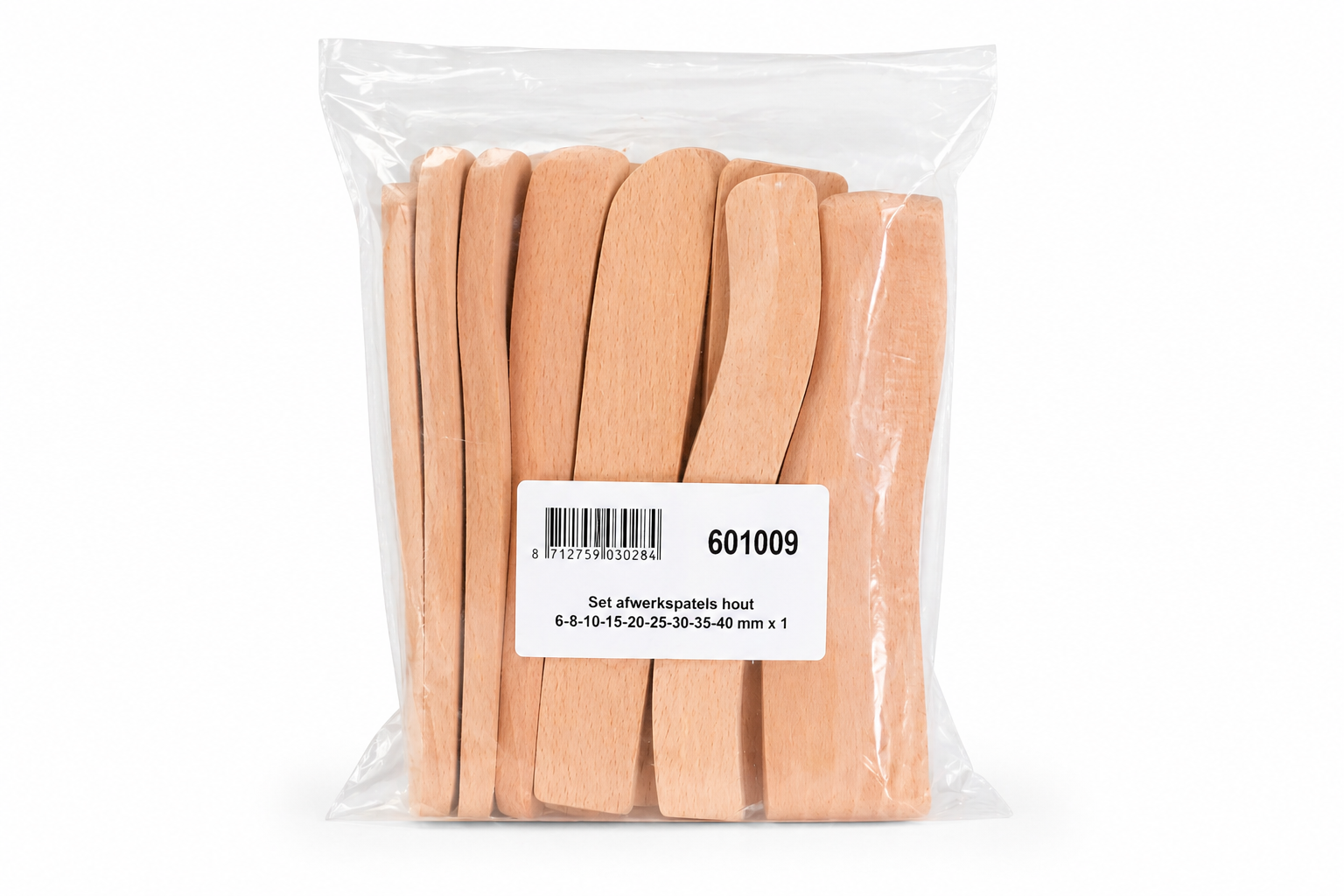 Set houten kitafwerk spatels (9 stuks van 8 tot 42mm), voor het makkelijk en goed afwerken van alle soorten kitvoegen.