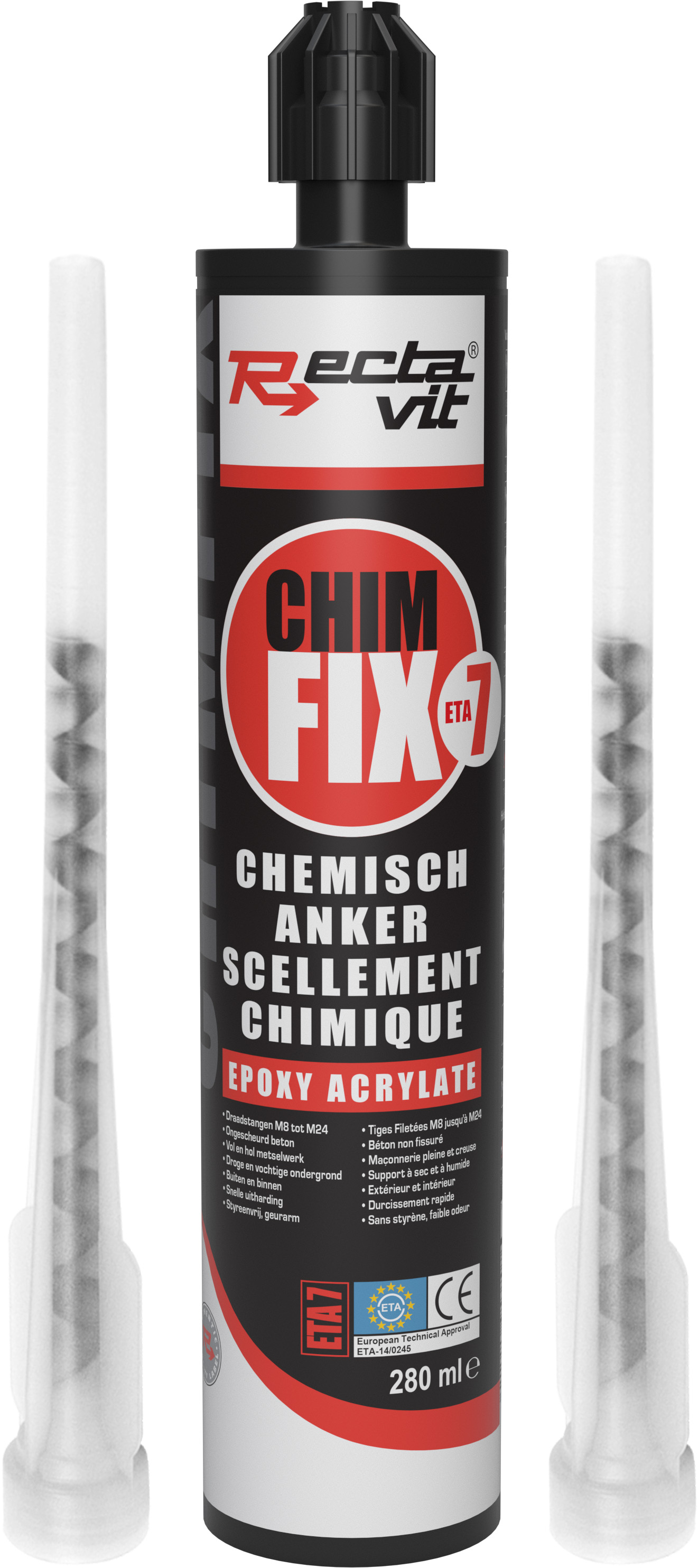 Rectavit Chimfix ETA-7 is een universeel 2-componenten chemisch anker voor het spanningsvrij bevestigen van zware laston in beton, natuursteen, hol en vol metselwerk, cellenbeton en kalkzandsteen.