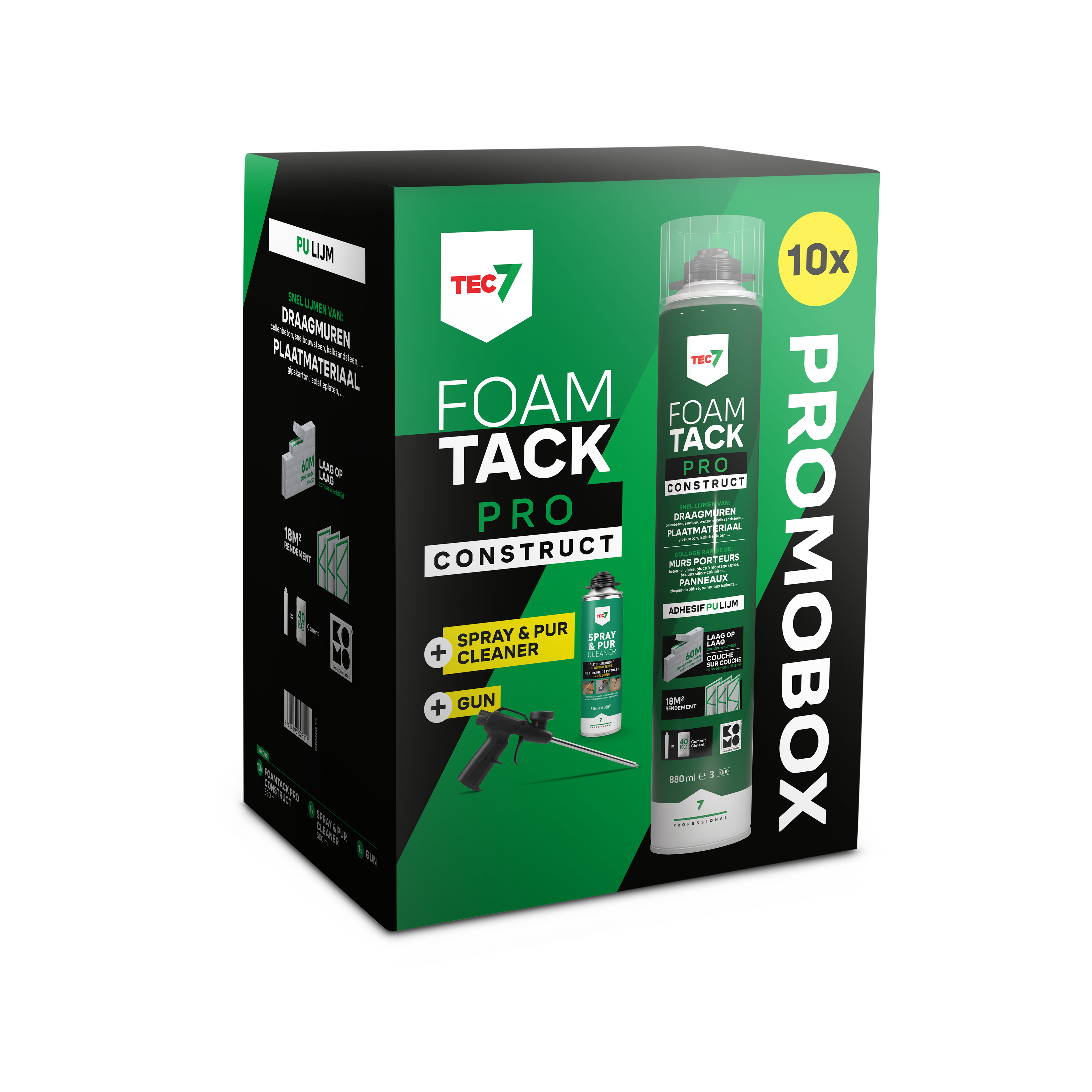 De Tec7 FoamTack Pro Construct Combipack is ontwikkeld voor het snel en betrouwbaar verlijmen van diverse constructiematerialen. Geschikt voor dragende en niet dragende muren en ideaal bij werkzaamheden waar snelheid en duurzaamheid belangrijk zijn.