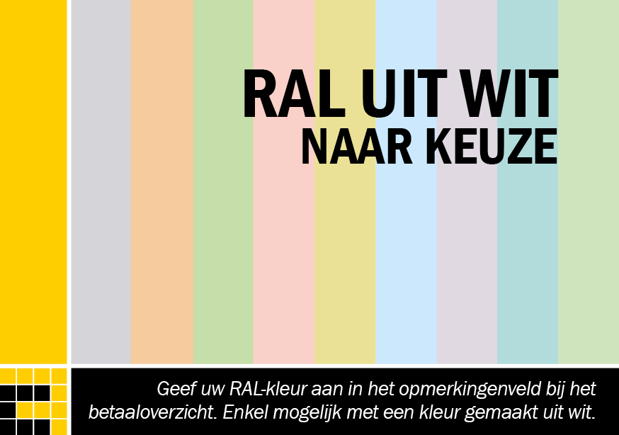 Wenst u een speciale RAL-kleur? Geef uw RAL-kleur naar keuze dan aan in het opmerkingenveld bij het betaaloverzicht.