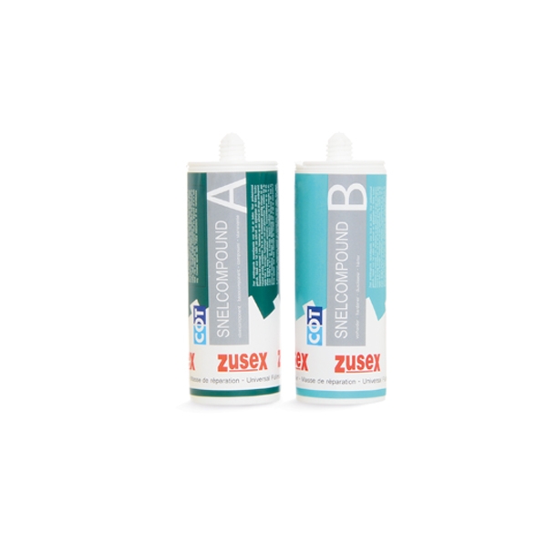 Een oplosmiddelvrij en sneldrogend reparatiemiddel voor kleinere herstelwerkzaamheden zoals spijker- en schroefgaten enz. Het product is op basis van een een-component epoxyhars. Ook de Zusex Snelcompound is blijvend elastisch en kan zowel binnen als buiten zonder gebruik van primer worden toegepast.