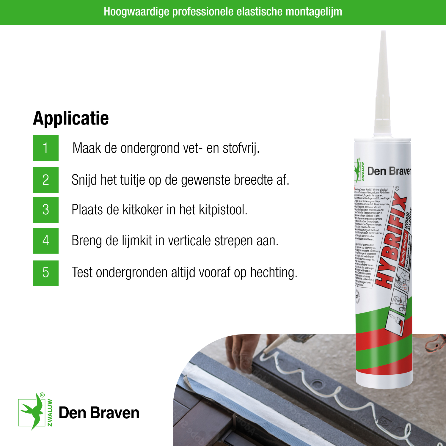 Hybrifix in verticale stroken aanbrengen. Onderlinge afstand circa 10 tot 20 centimeter. Belangrijk is dat de Hybrifix niet met dotten (rondjes) gezet wordt. Geadviseerd wordt om deze verlijmingskit te gebruiken in combinatie met dubbelzijdige tape 3mm dik. Deze dubbelzijdige tape ondersteund de kit gedurende 24 uur zodat de Hybrifix de juiste dikte heeft. Deze verlijmingskit is niet geschikt voor continue waterbelasting, beglazingsvoegen, natuursteen, spiegels en in combinatie met chloor (zwembaden). Voor het verwerken van deze kit zorgen dat de ondergrond schoon en droog is. Tot slot de ondergrond goed ontvetten met bijvoorbeeld een Zwaluw Cleaner.